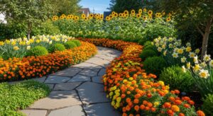 Mixing early bloomers like daffodils with late bloomers like chrysanthemums ensures you enjoy yellow blossoms throughout the year.